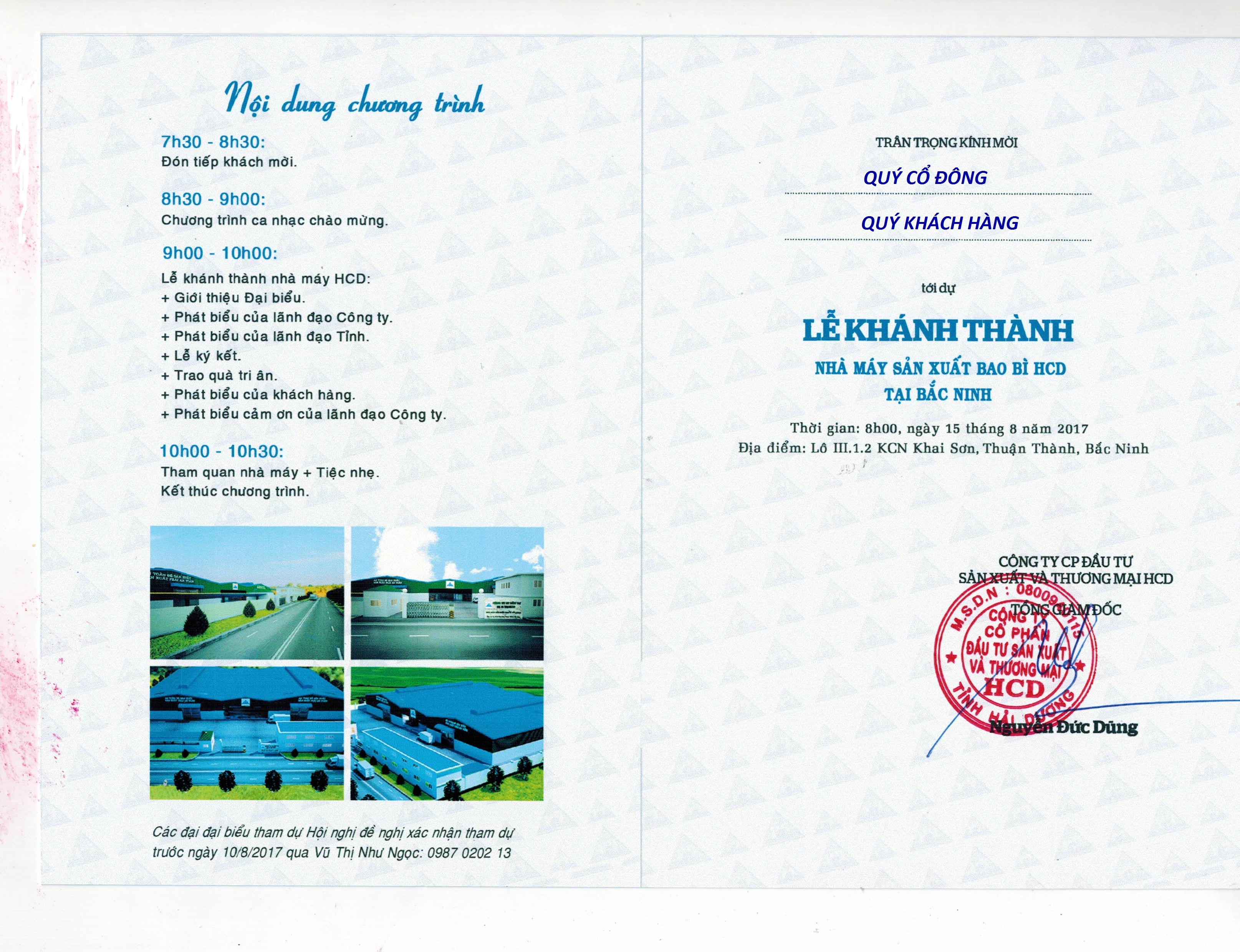 THƯ MỜI '' KHÁNH THÀNH NHÀ MÁY SẢN XUẤT BAO BÌ ''